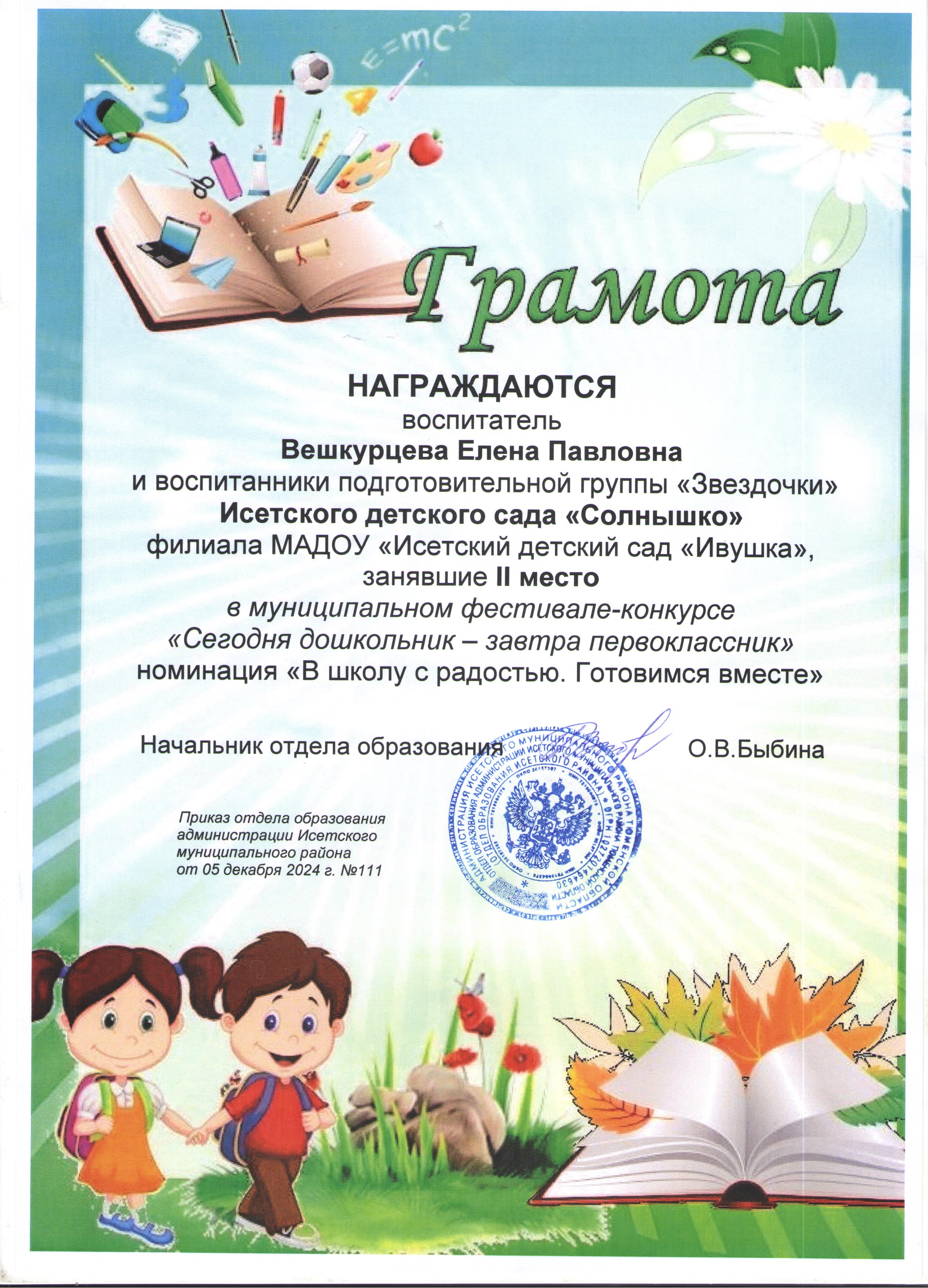 Грамота за победу в муниципальном фестивале - конкурсе "Сегодня дошкольник - завтра первоклассник", 2 место, 2024